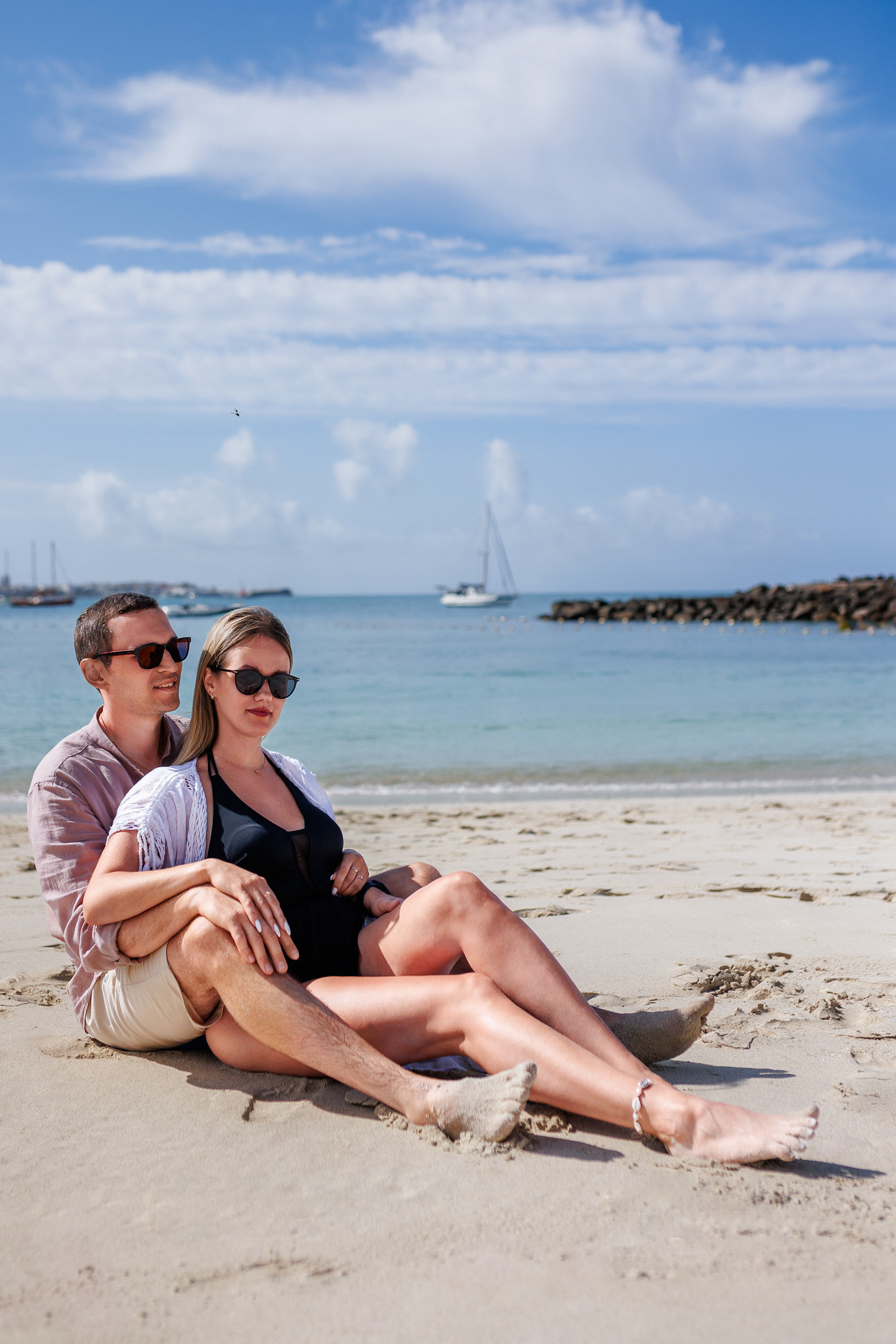 Create lasting memories at Anfi Beach with an enchanting photo shoot showcasing a couple's love story against the picturesque backdrop of a sailboat.